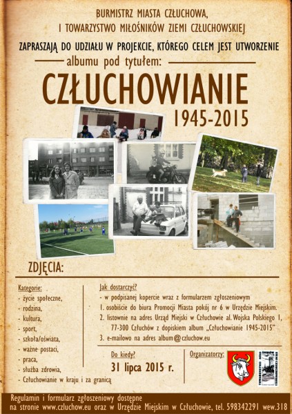 - Listownie na adres Urząd Miejski w Człuchowie al. Wojska Polskiego 1, 77-300 Człuchów z dopiskiem album „Człuchowianie 1945-2015”