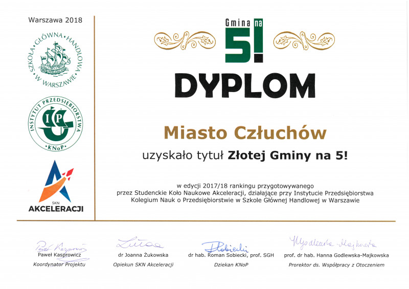 Miasto Człuchów uplasowało się na trzecim miejscu w kraju w ogłoszonym dzisiaj przez SGH rankingu jakości obsługi inwestorów drogą elektroniczną przez gminy. Zaowocowało to kolejnymi tytułami: „Złota Gmina na 5!” po raz drugi z rzędu i „Gmina na 5!” po raz trzeci z rzędu. Przyznaje je od roku akademickiego 2011/12 Zespół Badawczy funkcjonujący w ramach Studenckiego Koła Naukowego Akceleracji działającego przy Instytucie Przedsiębiorstwa w Szkole Głównej Handlowej w Warszawie. Wyróżnienie to świadczy o wysokiej jakości obsługi potencjalnych inwestorów przez urzędników. W całej Polsce tylko 53 samorządy otrzymały tytuł Gmina na 5!, a zaledwie 5 - Złota Gmina na 5!