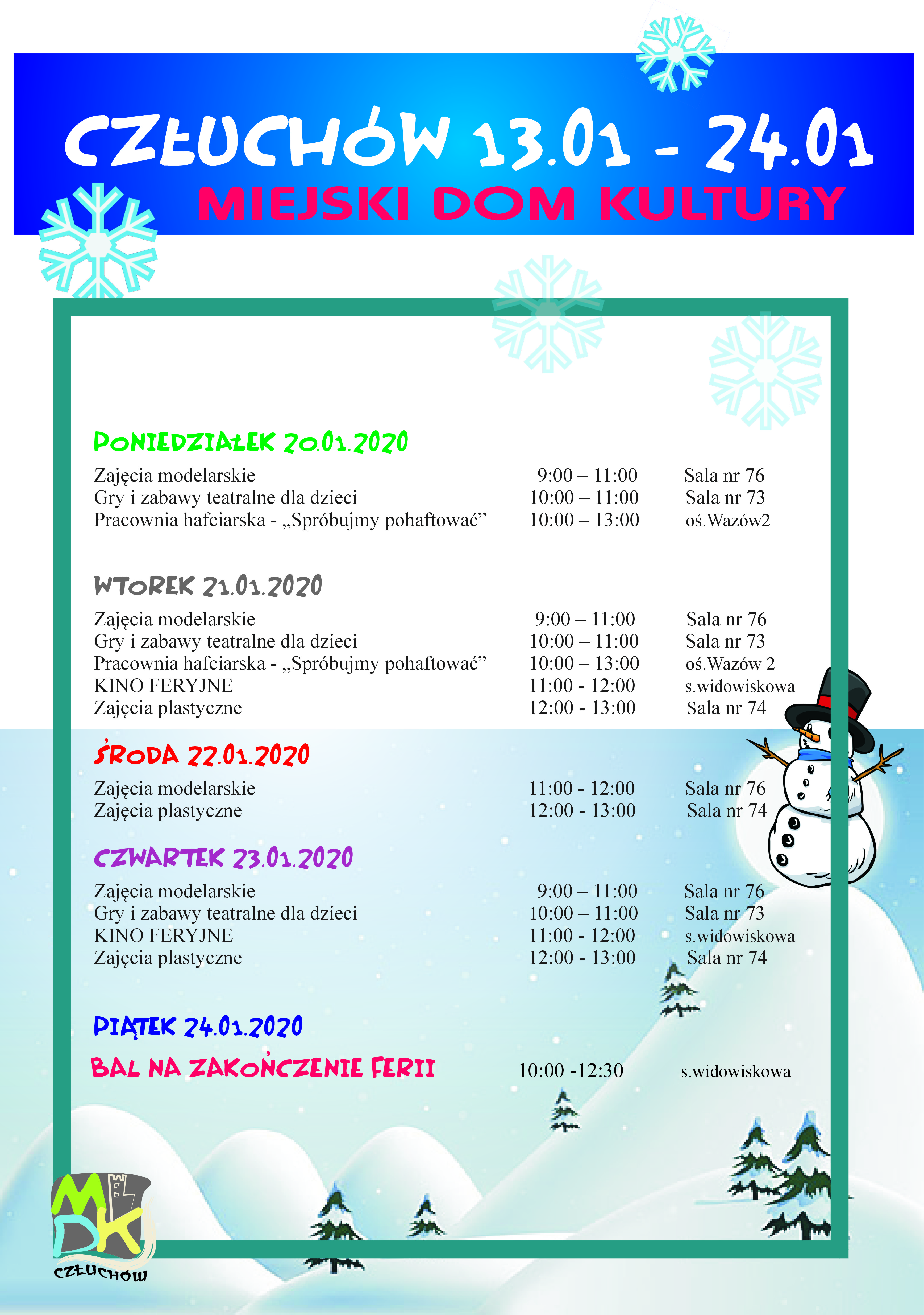 Już w najbliższy poniedziałek rozpoczynają się ferie zimowe, w związku z tym miejskie placówki przygotowały specjalną ofertę dla dzieci. Szczegóły na plakatach.