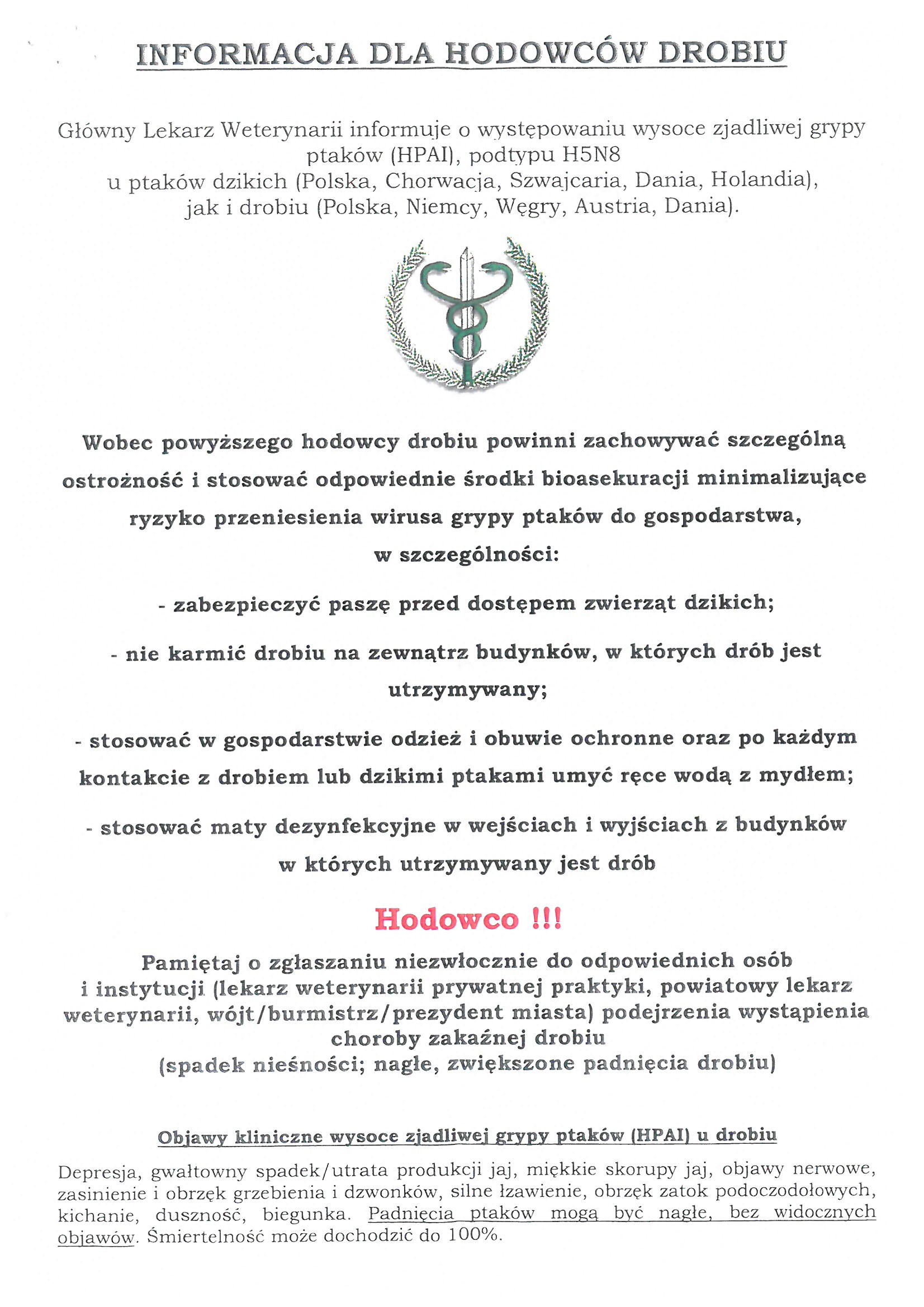 Główny Lekarz Weterynarii informuje o występowaniu wysoce zjadliwej grupy ptaków (HPAI), podtypu H5N8 u ptaków dzikich (Polska, Chorwacja, Szwajcaria, Dania, Holandia), jak i drobiu (Polska, Niemcy, Węgry, Austria, Dania).