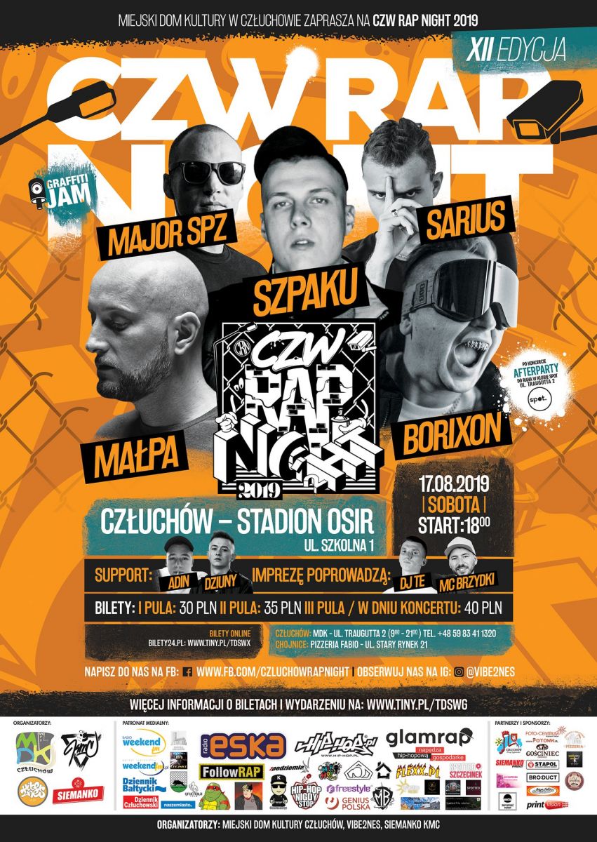 - Jak zwykle staramy się o to, aby było mnóstwo gwiazd tego rodzaju muzyki – zapowiada Adam Bondarenko, dyrektor Miejskiego Domu Kultury w Człuchowie. W tym roku na scenie pojawią się między innymi: Szpaku, Małpa, Major SPZ i inni. To wydarzenie adresowane nie tylko do młodych ludzi. Również dorośli miłośnicy rapu i hip-hopu powinni znaleźć coś dla siebie. CzW Rap Night jest organizowana w Człuchowie już po raz dwunasty. Jedną z atrakcji towarzyszących ma być graffiti, malowane na oczach publiczności. Gotowy obraz będzie pamiątką po tegorocznej edycji imprezy.