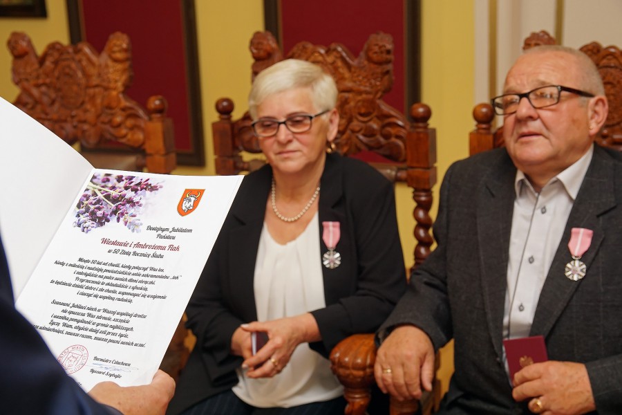 Państwo Wiesława i Ambroży Flak z Człuchowa świętowali 50-lecie małżeństwa. W Urzędzie Stanu Cywilnego w Człuchowie odbyła się z tej okazji niecodzienna uroczystość. Jubilaci otrzymali nie tylko życzenia i upominki od władz miasta, ale także okolicznościowe medale przyznane przez Prezydenta Rzeczpospolitej Polskiej.