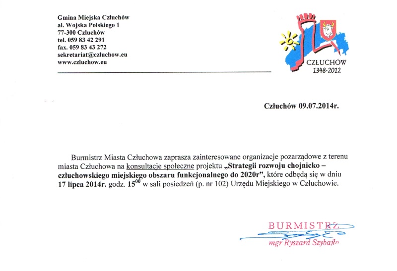 Burmistrz Miasta Człuchowa zaprasza wszystkich zainteresowanych mieszkańców Człuchowa oraz zainteresowane organizacje pozarządowe z terenu miata Człuchowa na konsultacje społeczne projektu "Strategii rozwoju chojnicko-człuchowskiego miejskiego obszaru funkcjonalnego do 2020 r.", które odbędą się w dniu 17 lipca 2014 r. o godz. 15:00 w sali posiedzeń (p. nr 102) Urzędu Miejskiego w Człuchowie.