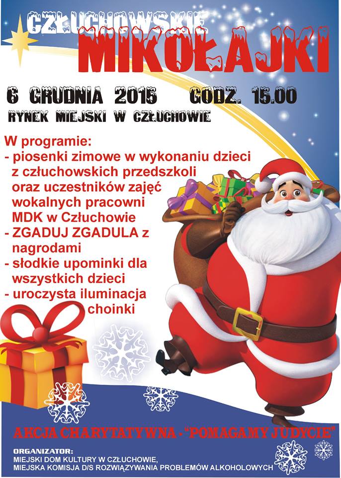 Serdecznie zapraszamy na człuchowskie mikołajki, które odbędą się 6 grudnia o godz. 15 na rynku.