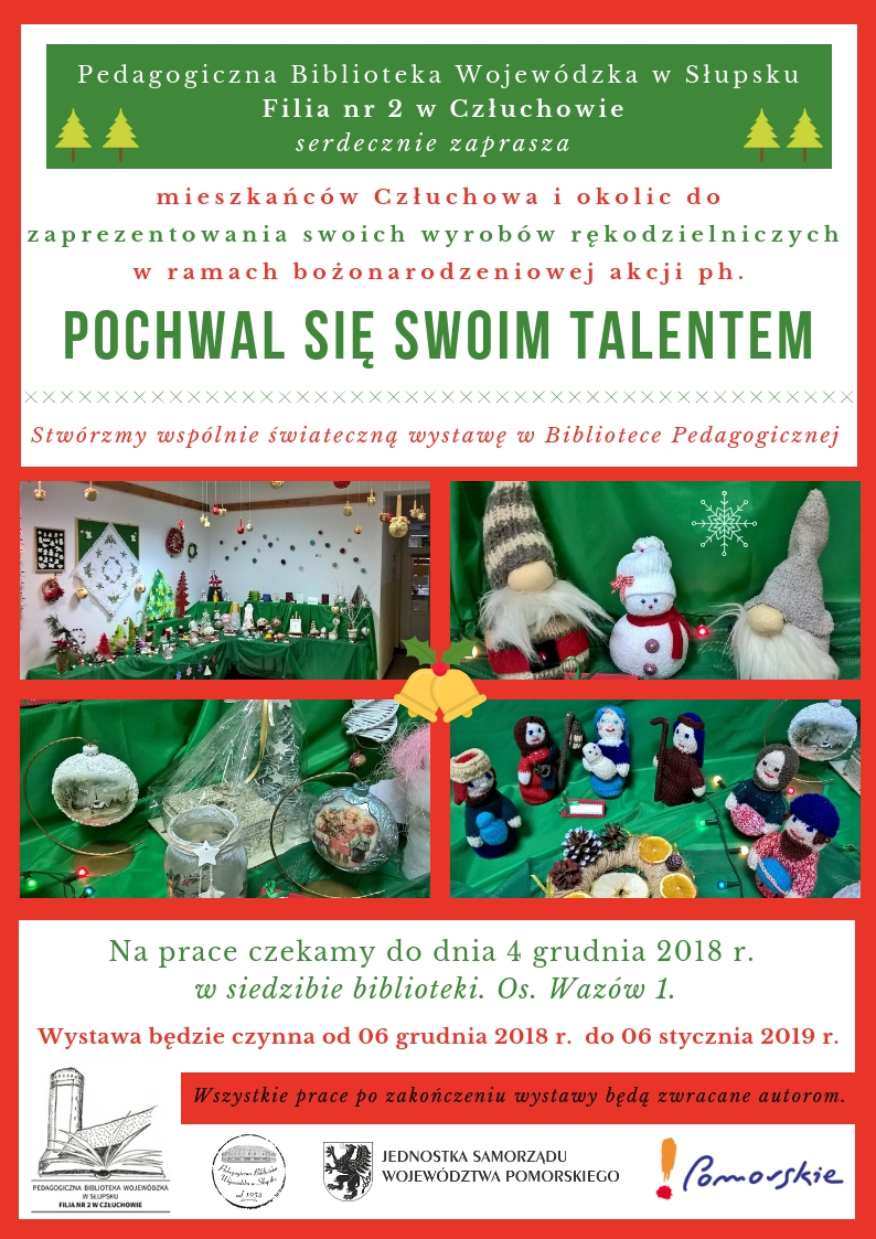 Człuchowska filia Pedagogicznej Biblioteki Wojewódzkiej w Słupsku zaprasza do udziału w kolejnej edycji bożonarodzeniowej akcji ph. "Pochwal się swoim talentem". Szczegóły na plakatach. Zapraszamy