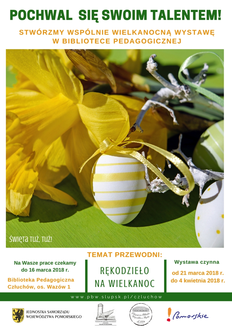 Biblioteka Pedagogiczna w Człuchowie zaprasza do wzięcia udziału w drugiej odsłonie konkursu "Pochwal się swoim talentem" tym razem tematem przewodnim prac będzie Wielkanoc. Szczegóły w załączeniu. Zapraszamy!