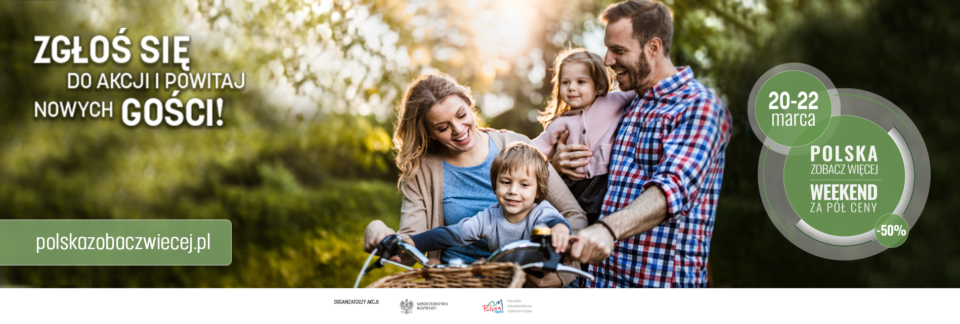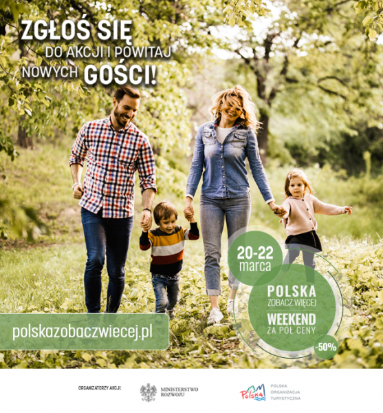 Ruszył nabór do 8. edycji akcji „POLSKA ZOBACZ WIĘCEJ – WEEKEND ZA PÓŁ CENY”. Zapraszamy przedsiębiorców z branży turystycznej, instytucje samorządowe, hotelarzy, restauratorów, organizacje i instytucje związane z obsługą ruchu turystycznego, a także organizatorów eventów sportowych - rejestracja trwa do 31 stycznia. Wiosenna edycja odbędzie się w weekend 20-22 marca. Udział w akcji to nie tylko szansa na pozyskanie nowych klientów z Polski i za granicy, ale także doskonała okazja do darmowej reklamy.