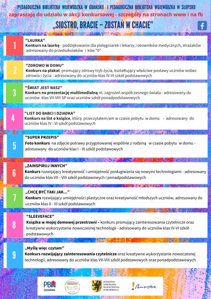 Nauczyciele bibliotekarze bibliotek pedagogicznych województwa pomorskiego zapraszają do udziału w konkursach organizowanych dla przedszkoli oraz uczniów klas I- VIII i szkół ponadpodstawowych. Konkursy prezentowane są pod wspólną akcją: „Siostro, Bracie – zostań w chacie”.