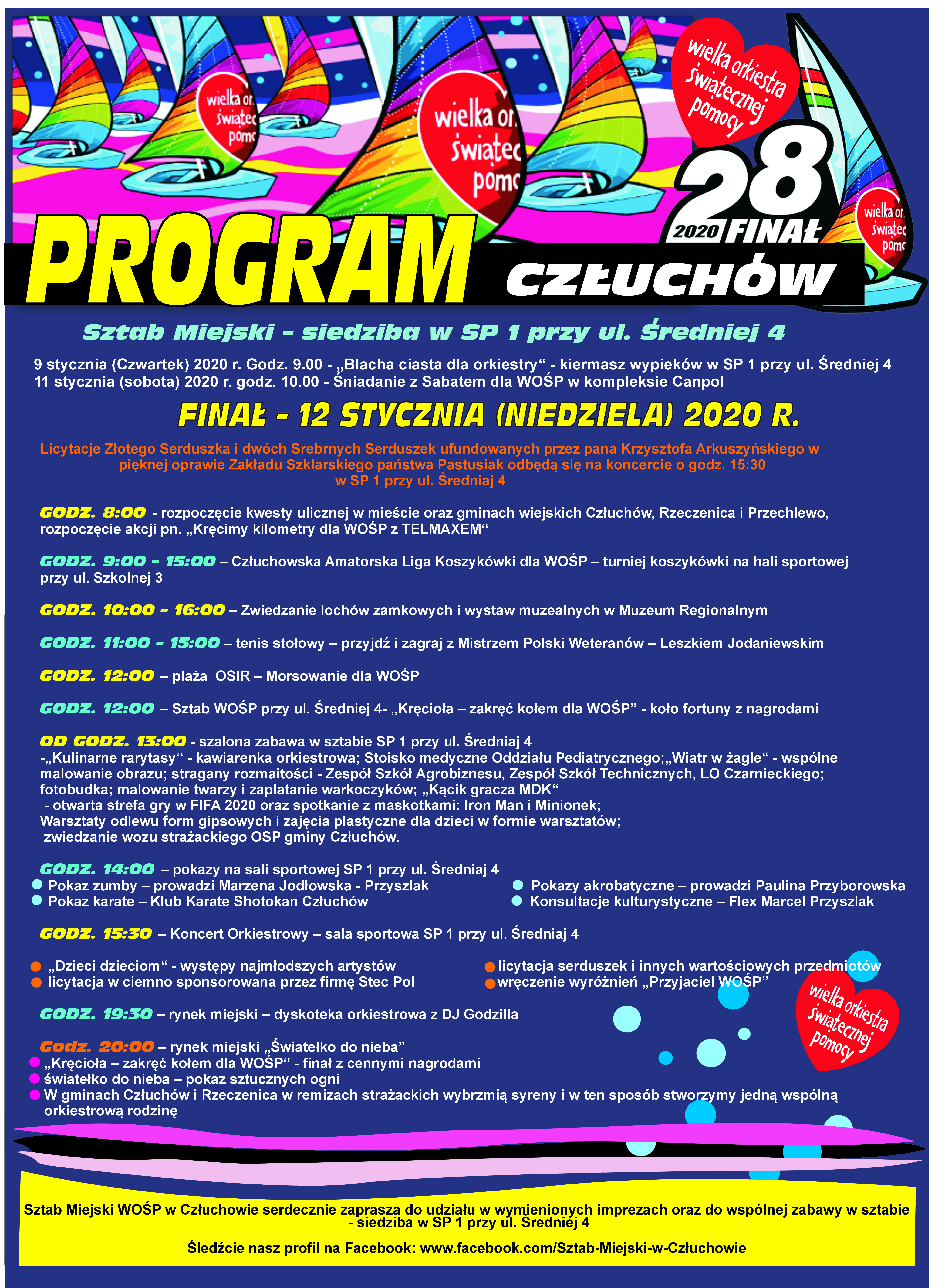 Koncerty i licytacje rozpoczną się o godzinie 15.30. Jak zawsze w Człuchowie będzie można zdobyć złote i srebrne serduszka przygotowane przez miejscowego złotnika. O 19.30 zabawa ze sztabu przeniesie się na człuchowski Rynek. Jej finałem będzie tradycyjne Światełko do Nieba.