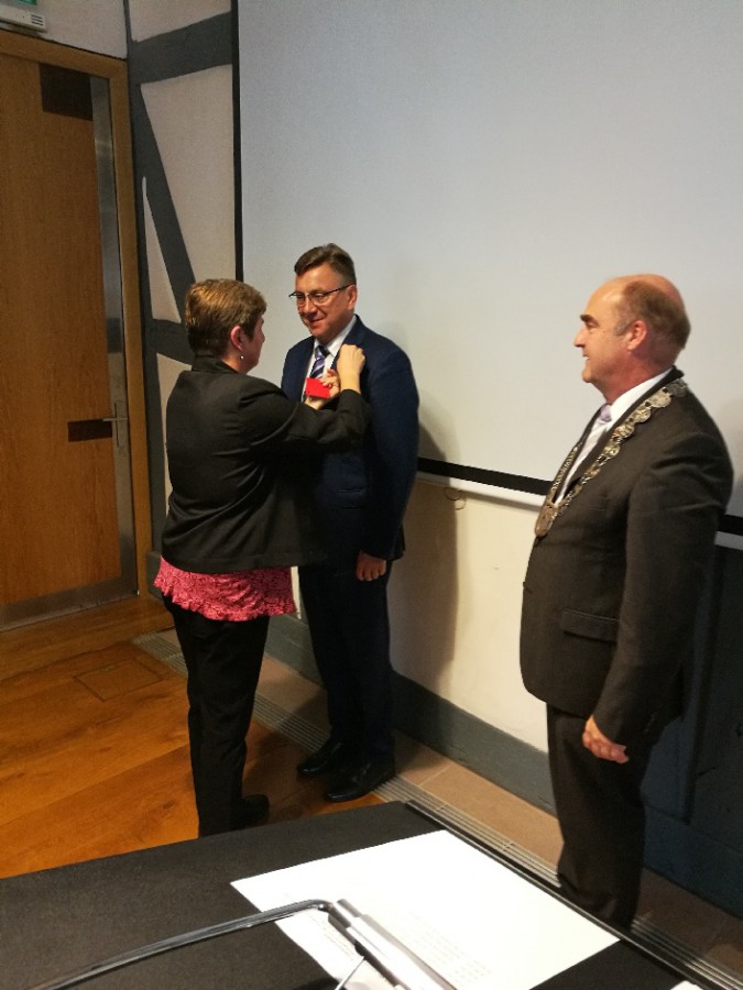 ZŁOTA SZPILKA HONOROWA DLA BURMISTRZA NA 20-LECIE PARTNERSTWA MIAST