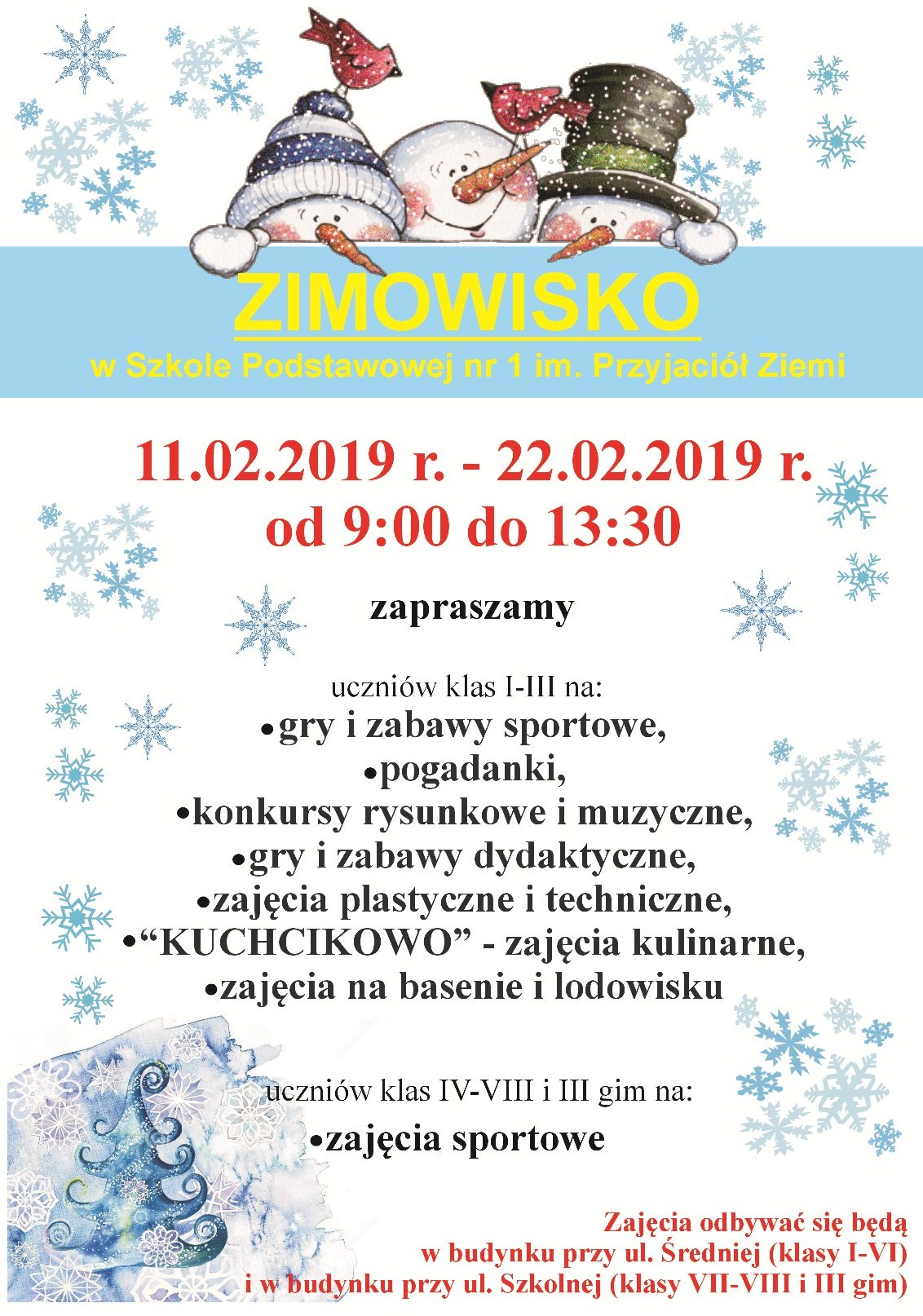 Szkoła Podstawowa nr 1 im. Przyjaciół Ziemi organizuje zimowisko w czasie ferii zimowych. Serdecznie zapraszamy! Szczegóły na plakacie